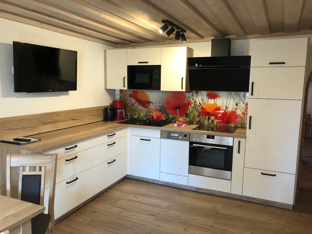 > komplett ausgestattete Küche mit E-Herd, Kühlschrank, Geschirrspüler, Kaffeemaschine, Wasserkocher und Mikrowelle